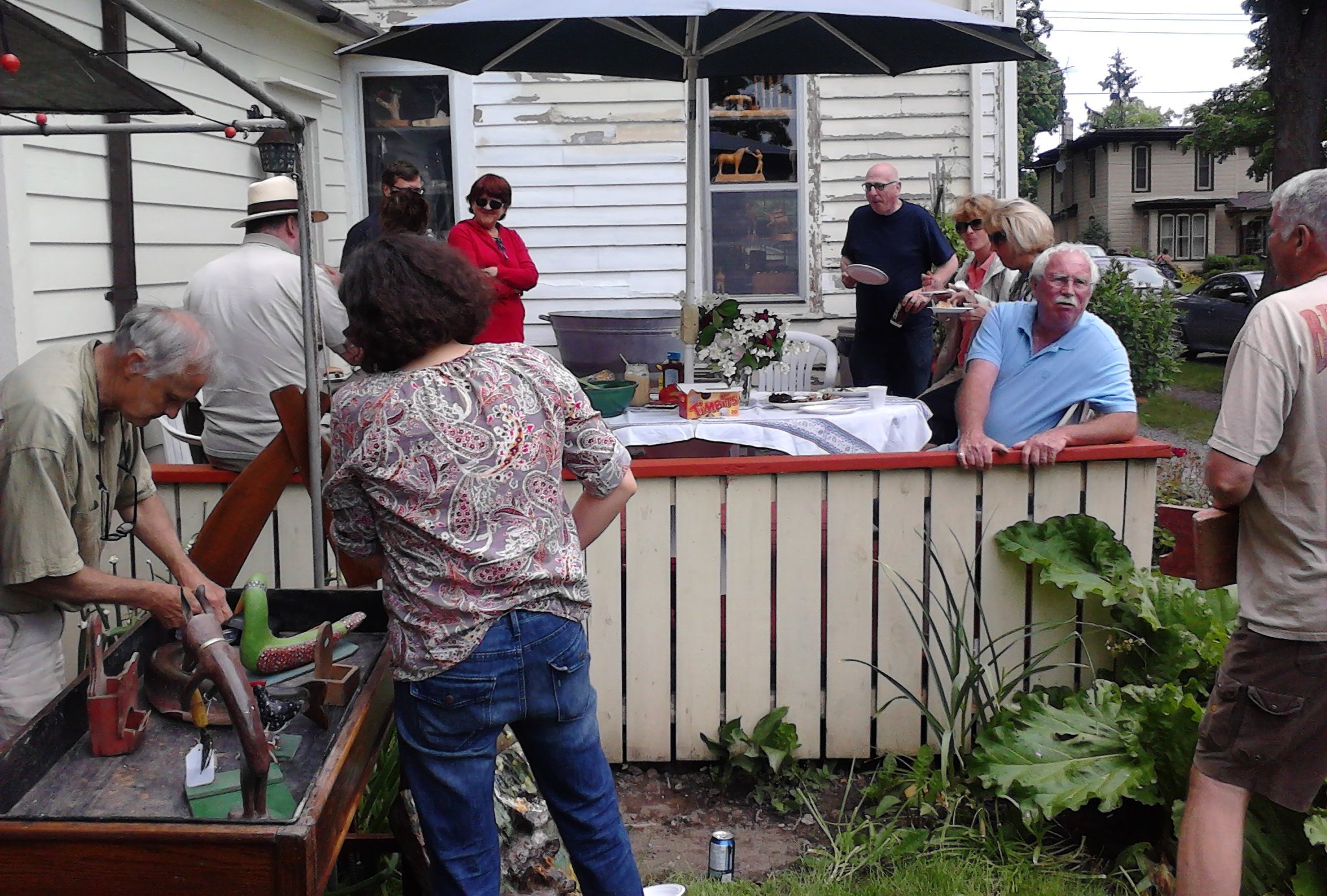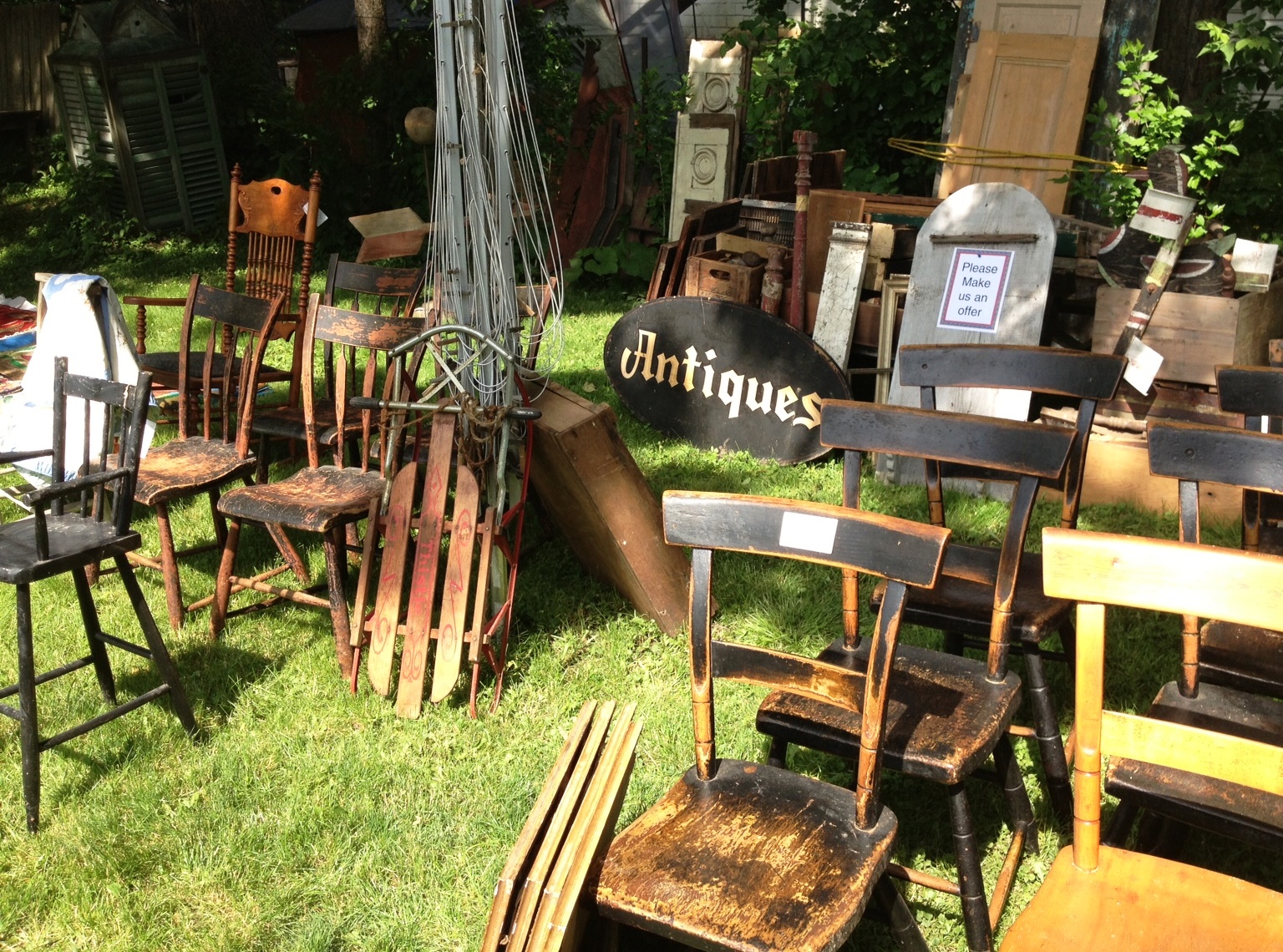 It happens to all collectors and dealers.  You go about your business, buying job lots, or whole collections to obtain some great pieces, and along with the “great” comes the “not so great”, but the “good enough” to  be put aside in your overflow area, be it basement or barn for future consideration.  Then along comes the day when you can no longer move in those places and that’s when it’s time to download.  Seriously, do not even consider renting more storage space because you will just fill it up in no time. So you can either take the stuff to the auction, or have a yard sale, or a bonfire.  My experience with auctions suggests that although they do provide finality, with this type of stock you are looking at maybe 5 cents on the dollar.  I could never burn even lousy furniture so why not have a yard sale?  And why not combine it with a customer appreciation BBQ.  Since we no longer do field shows, we have been missing those opportunities to have friendly negotiations and casual exchanges.  Plus customer Good Will is a valuable commodity which must be nurtured. .