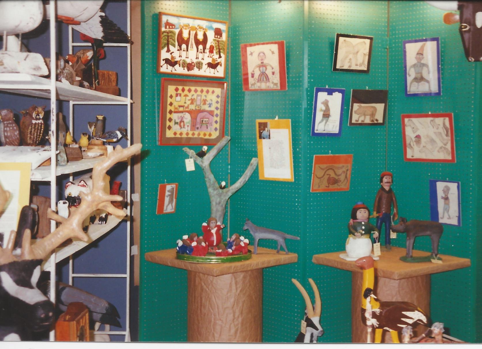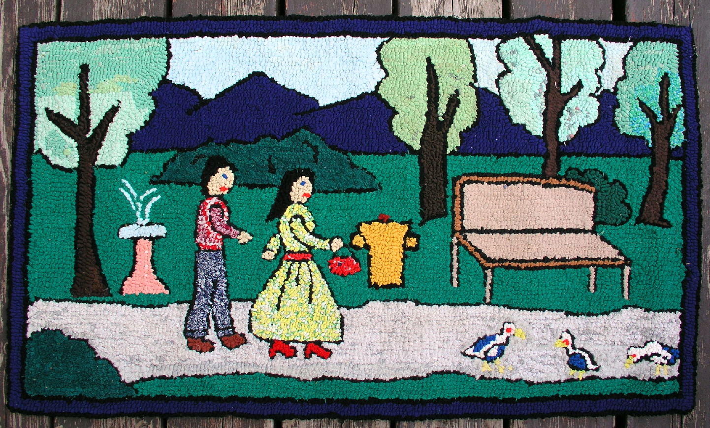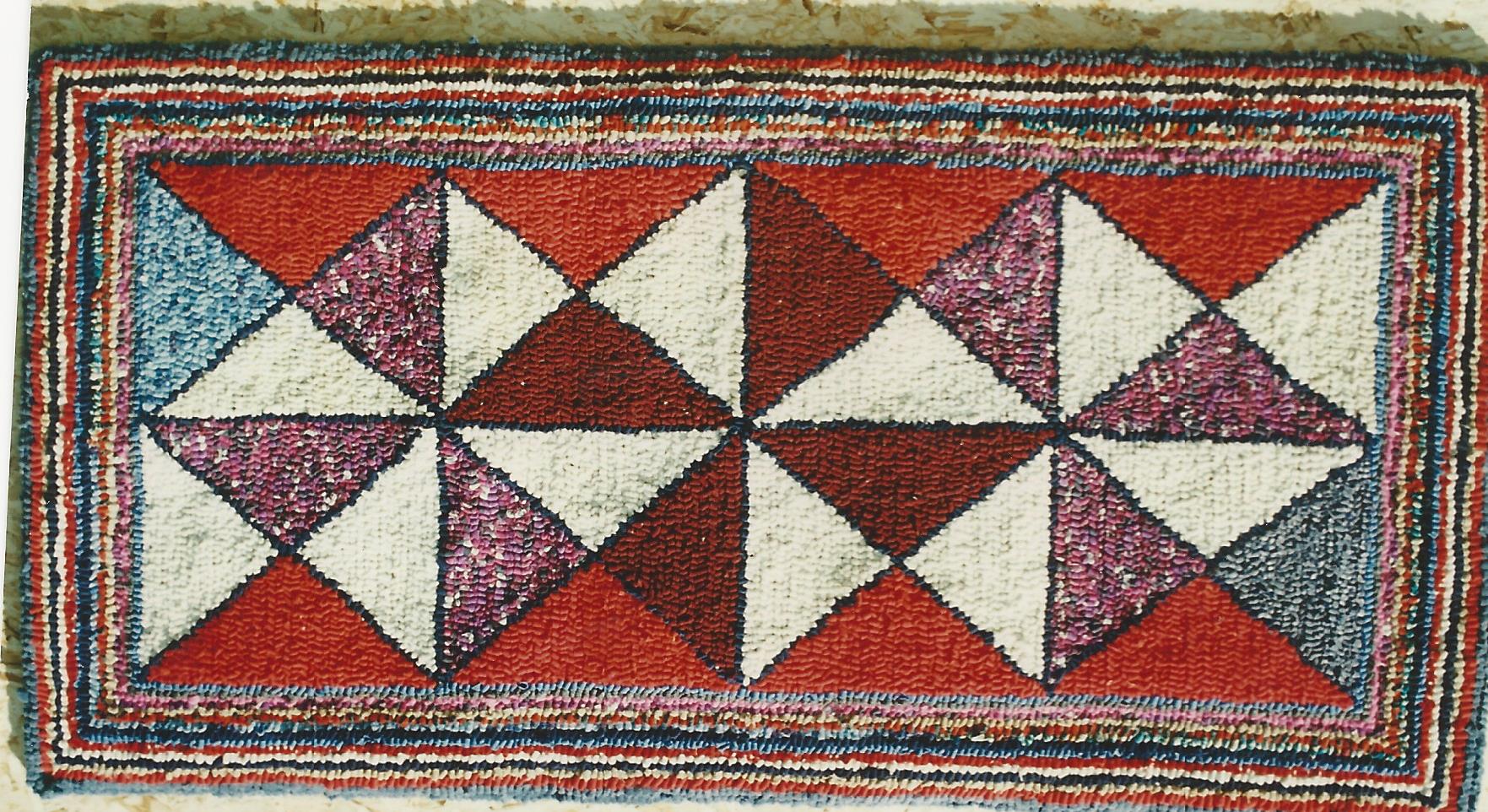 In the late 1980’s when we were antique shopping in Quebec on a regular basis, we would follow up on leads for new sources that were offered to us by other dealers. We were told about a great shop in the town of Deschambault, which is on Rt. 138 on the north shore of the St. Lawrence river between Trois Rivieres and Quebec city. Rte. 138 was a popular tourist route back in the heyday of motoring vacations in the fifties and the sixties, but traffic dropped dramatically when the auto-route 40 opened and people’s attitude changed, and they started to just want to get from point A to B as quickly as possible. There wasn’t much of the old “motoring” culture left along the route, but it was a gorgeous drive and every so often you would spot a handmade sign in front of a little roadside shack indicating “Souvenirs”. Naturally we would stop and check it out. You never know when and where you may find the next great folk artist or crafts-person. Most of these shops were a disappointment however in that they contained the St. Jean-Port-Jolie style tourist carvings, and the typical plastic commercial schlock, but once in a while we would find some crazy, old guy making something interesting, or in this case of this story, a great source of charming, original designed hand hooked rugs.