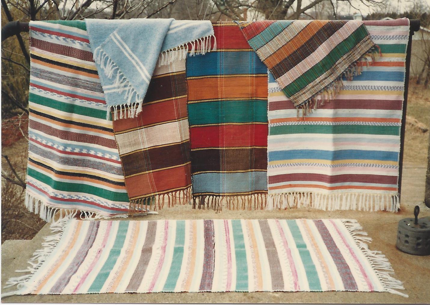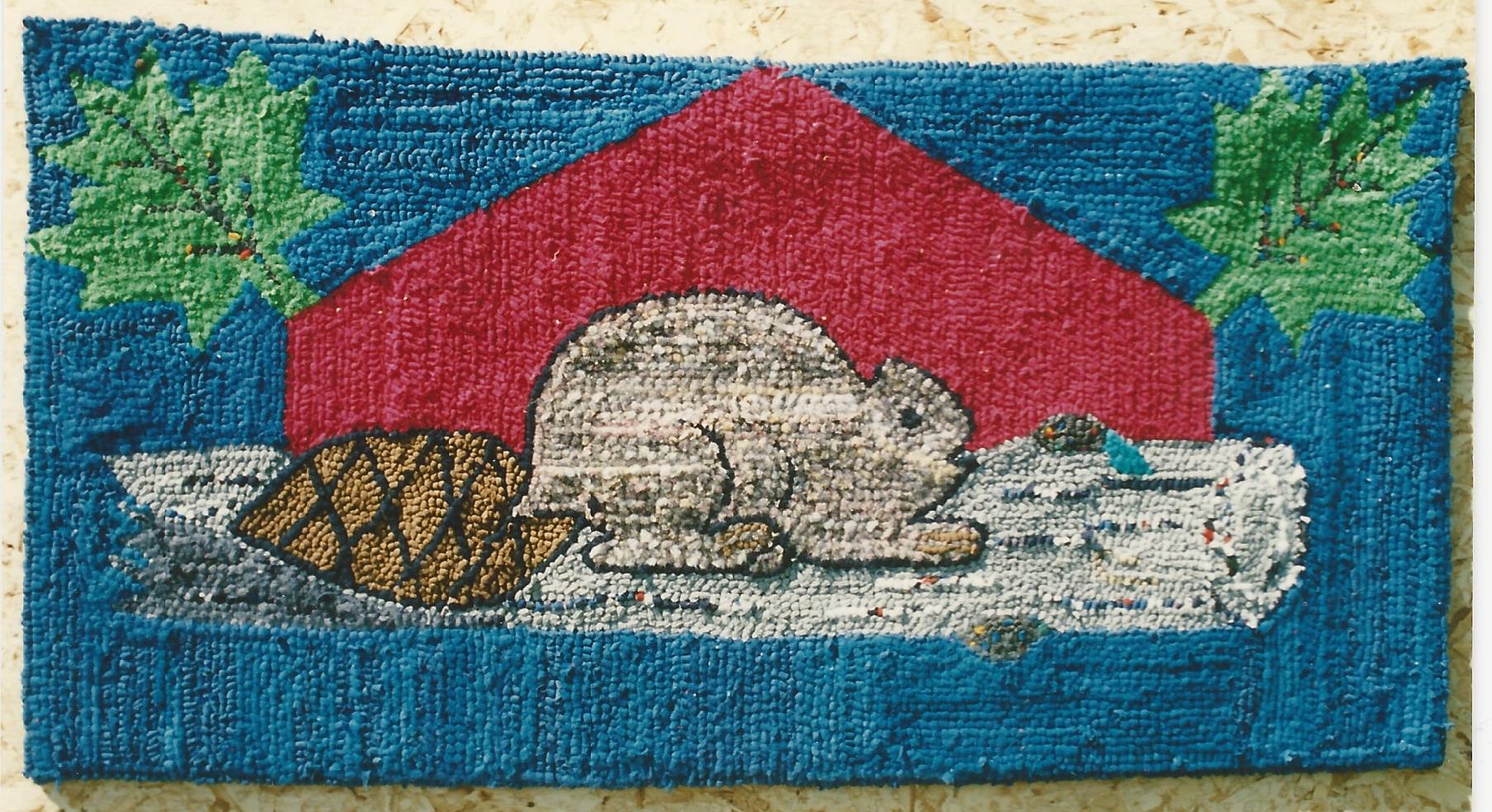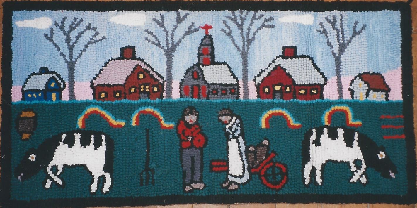 Our attention moved from her to the rugs, and we were immediately taken with the charming original subjects, the vibrant colors, and the workmanship. The expected florals and geometrics were interesting, but what caught our attention were the many depictions of rural Quebec life. Scenes of bringing in the ducks at night, of workers stopping in the field to observe the “angelus” or moment of prayer at 6 pm, a sugaring scene in early spring, a farmer about to feed the animals, and so on. There were also riffs on classic themes like a beaver on a log, a maple leaf. As well there were tables full of multi coloured runners. Rainbows in fabric everywhere you looked. The prices were very reasonable considering the amount of work that went into them, and you could see that they were well made, and would wear well. She was surprised and delighted when instead of choosing one or two, we bought a dozen or so. We explained who we were and that we were buying for resale, and that if they should sell as we thought they would we would soon be back for more. And so it was. They went like hotcakes and within a month we were back buying about twice as many as before. Madam Tessier grew to look forward to us pulling up.