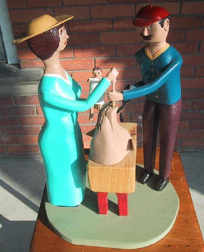 We used to see Bill’s work from time to time at the picker’s barns, and then in the mid-nineties a collector friend noticed one of his paintings in our truck and said “That’s one of Bill’s paintings. I know where he lives. Would you like to meet him?”. Sure thing. So with directions in hand, and a phone call ahead we arrived mid-morning at a three story, 1940’s apartment block near the baseball diamond at the edge of town. Bill buzzed us in and we climbed to the second floor and arrived at his door. He must have been standing right on the other side because the second we knocked the door flew open and there stood Bill, all smiles, peering through those thick glasses. His small one bedroom apartment was that of your old bachelor uncle’s pad. Tidy, but full of upholstered chairs, crochet covered tables, and knick-knacks; with every square inch of wall space covered by his paintings in every type, colour, and size All in reclaimed frames of every type and colour. The effect was a bit dizzying, but also warm and hospitable. “Everything is for sale, and at reasonable prices”, and so we picked out our favourite twenty or so and paid him what he asked in cash. Bill didn’t talk much, and he never offered to make us tea or anything, but over a few visits he did start to warm up and tell us some stories from when he was in Europe, and one funny story of how he almost got killed in his workshop. Well, funny because no one got hurt.