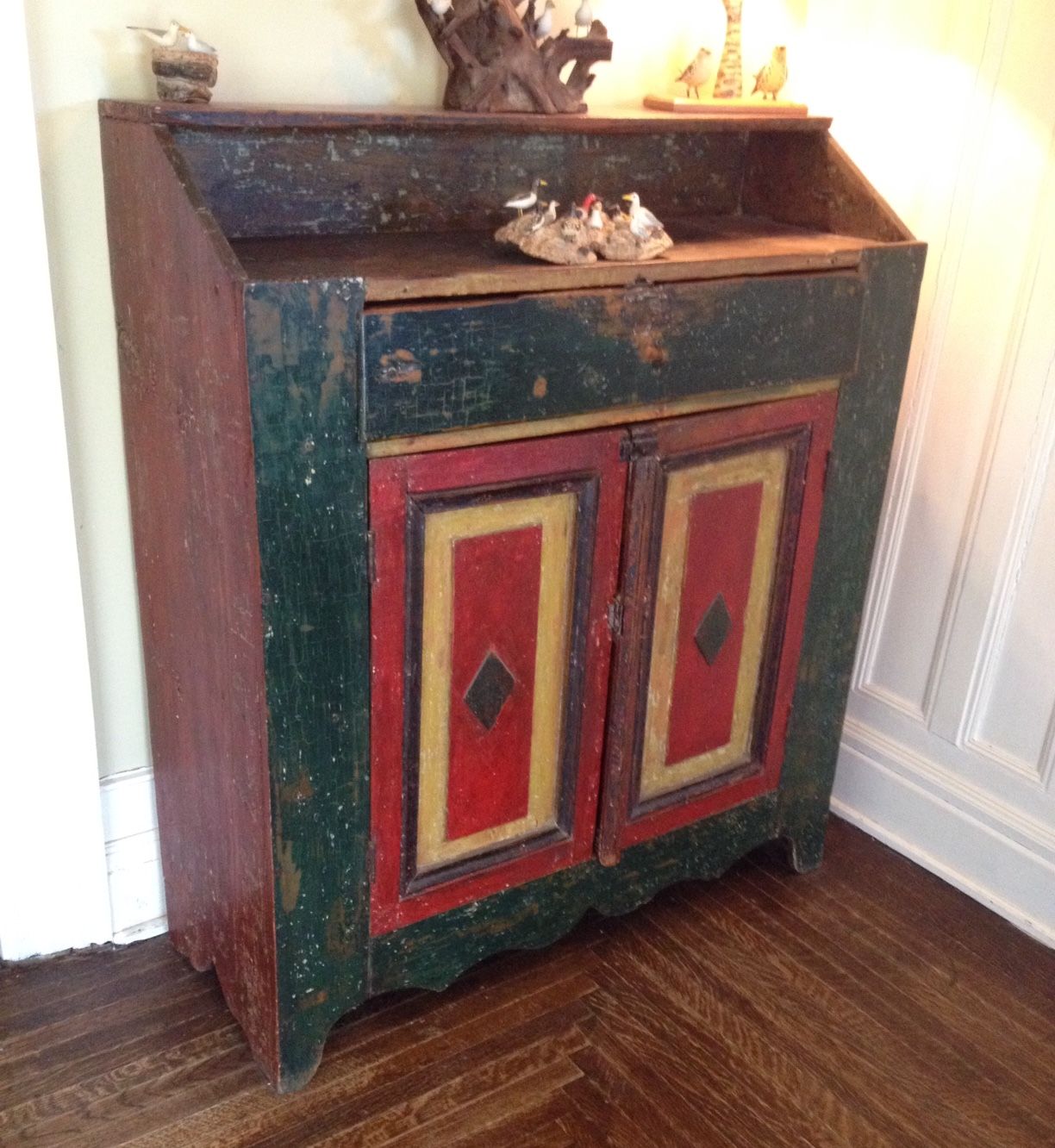 In the mid 1990’s we did what turned out to be a one time show in the Laurentians ski area north of Montreal. During ski season in the club house of a popular ski hill. The assumption was that the multitude of skiers would come off the slopes and couldn’t help themselves from wandering through the show and selecting a few prime antiques for their ski chalets. Turns out this assumption was wrong, and we spent three days watching people ski, and then going directly to their cars and leaving. We rented a chalet with friends and so when we were not busy doing nothing at the show we at least had some good food and laughs in commiseration. It turned out to be a pretty expensive venture which didn’t really pay off, if it was not for the fact that in being there we came across one of the best and most important pieces of Quebec folk art we had ever encountered.